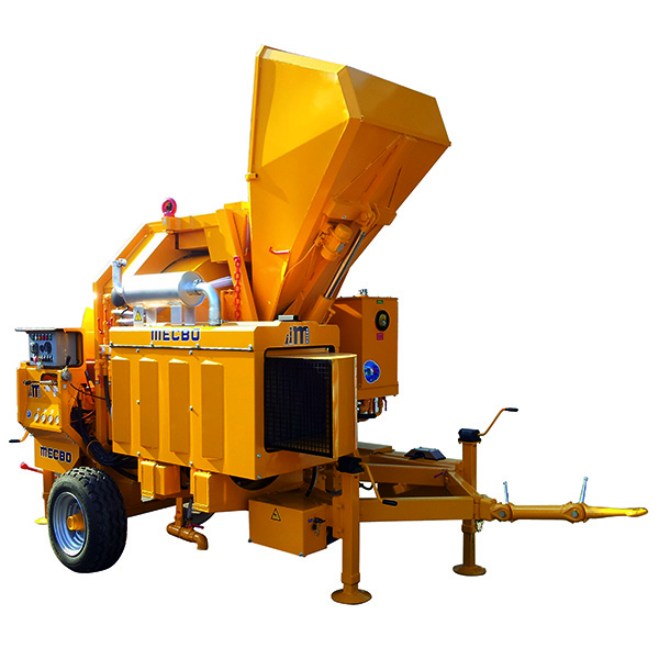 Pompa installata su assale con ruote in gomma, composta da betoniera con capacità di 750l e gruppo pompante fino a 25m³/h e 70 bar in uscita.